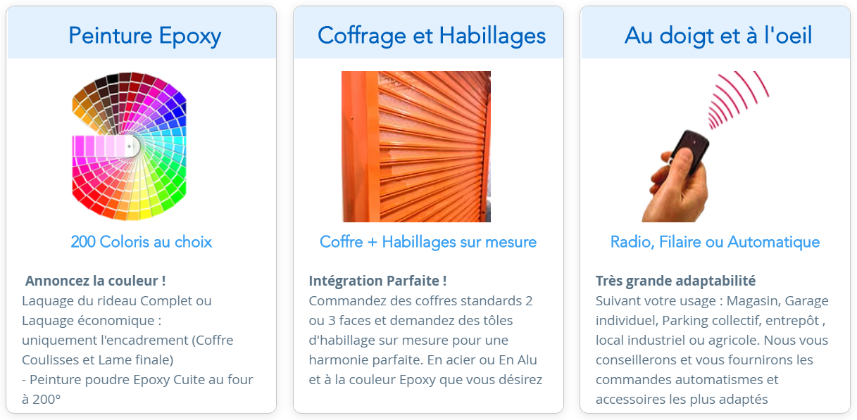 | Finition Epoxy (en option) | Peinture poudre Epoxy encadrement (Coulisses et lame finale) Finition peinture Epoxy Coffre en option |